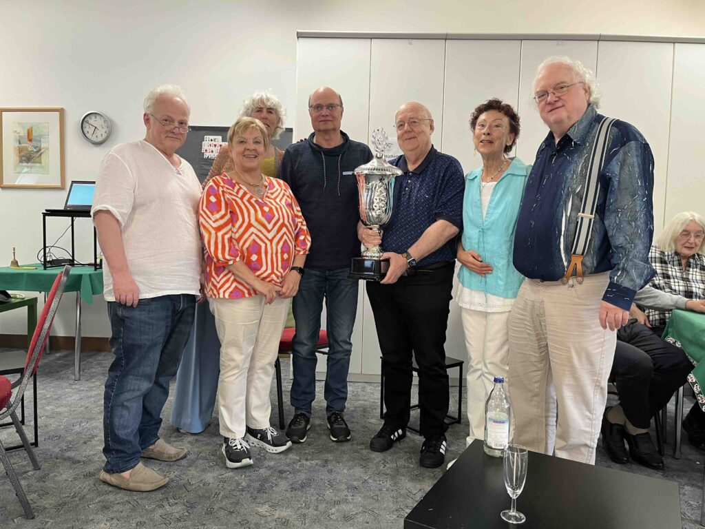 Gewinner der diesjährigen Club Paarmeisterschaft sind Christian Nagel und Jürgen Grundstein mit 62,88 % (Mitte), gefolgt von Jutta Hendel und Harald Germer, knapp dahinter mit 62,42 % (rechts). Dritte wurden Klaus Polap und Erika Lindenthal mit 61,36 % (links). Sie haben sich gegen insgesamt 24 Paare behauptet.